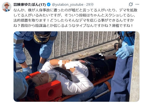 「なんか、僕が人身事故に遭ったのが嘘だと言ってる人がいたり、デマを拡散してる人がいるみたいですが、そういう投稿はちゃんとスクショしてるし、法的措置を取ります!」と書き出した上で「どうしたらそんなデマを信じる事ができるんですかね?」と投げかけた。救急車で運ばれる写真を公開し「普段から陰謀論とか信じるようなタイプなんですかね?滑稽ですね!」とつづった。