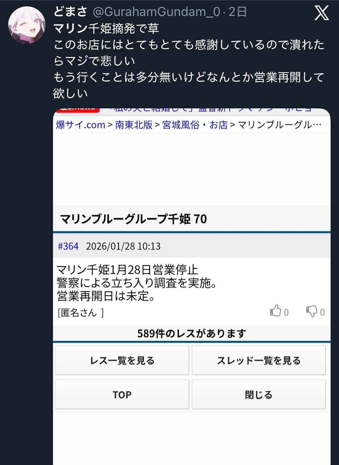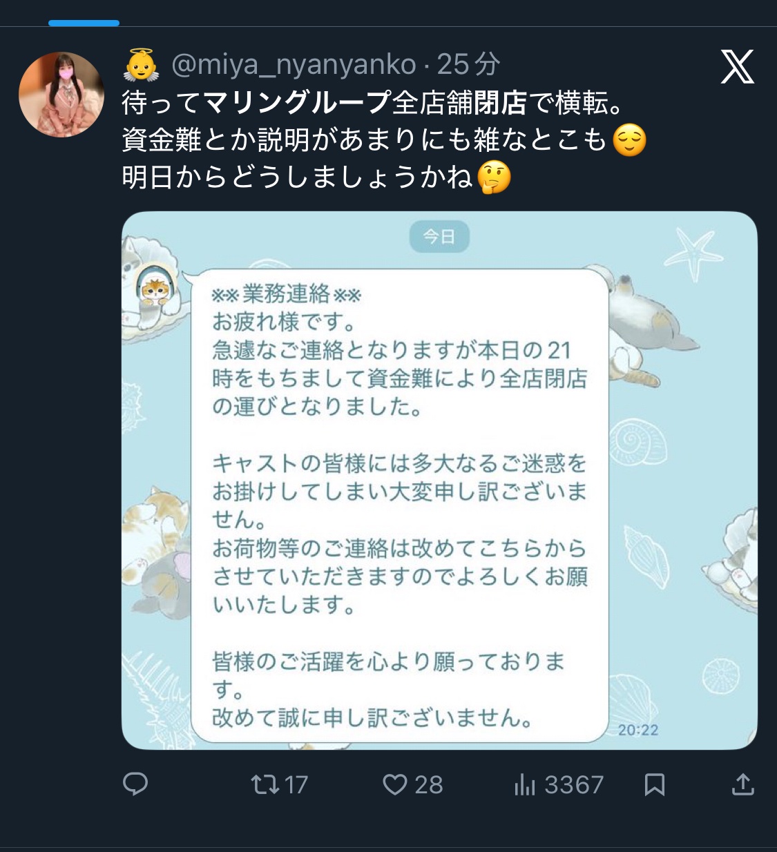マリングループって全国に21店舗あるらしいよ。そこに在籍してた女の子達が明日から働く場所なくなるとかエグいな。