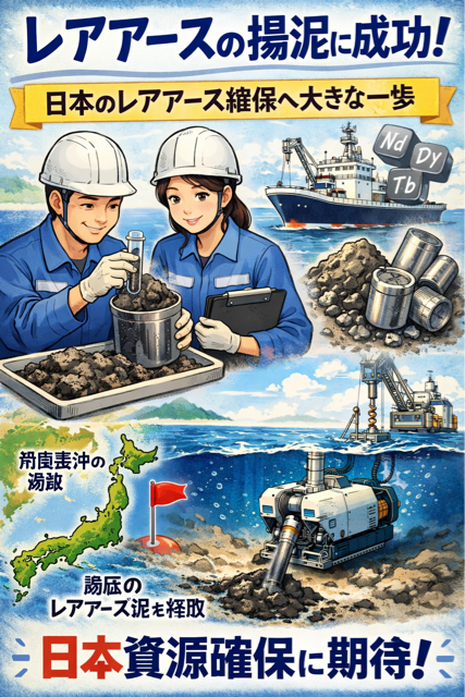 • 2026年1月〜2月:地球深部探査船「ちきゅう」を用いた試験掘削(揚泥試験)が実施され、世界初の水深約6,000mからのレアアース泥回収に成功しました(機器の作動確認、少量揚泥、環境モニタリングが主目的)。これにより「国産レアアース元年」と位置づけられる重要なステップとなりました。帰港は2月14日予定で、すでに成功が報告されています。