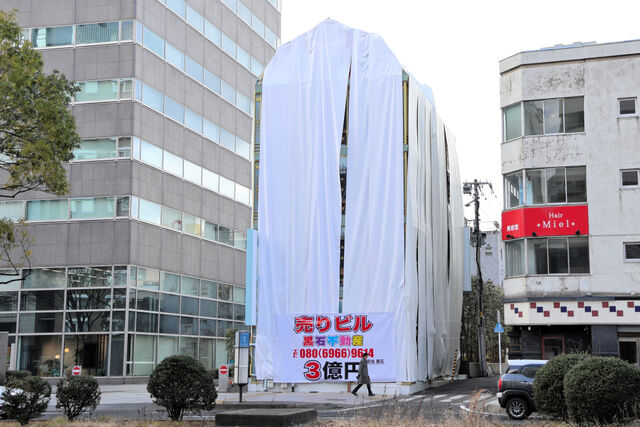 1月30日付で売りに出されたのは、築66年の鉄筋3階のビル1棟と土地約120平方メートル。ビルは現在、全体が白いシートで覆われ、「売りビル 3億円」などと記されている。
