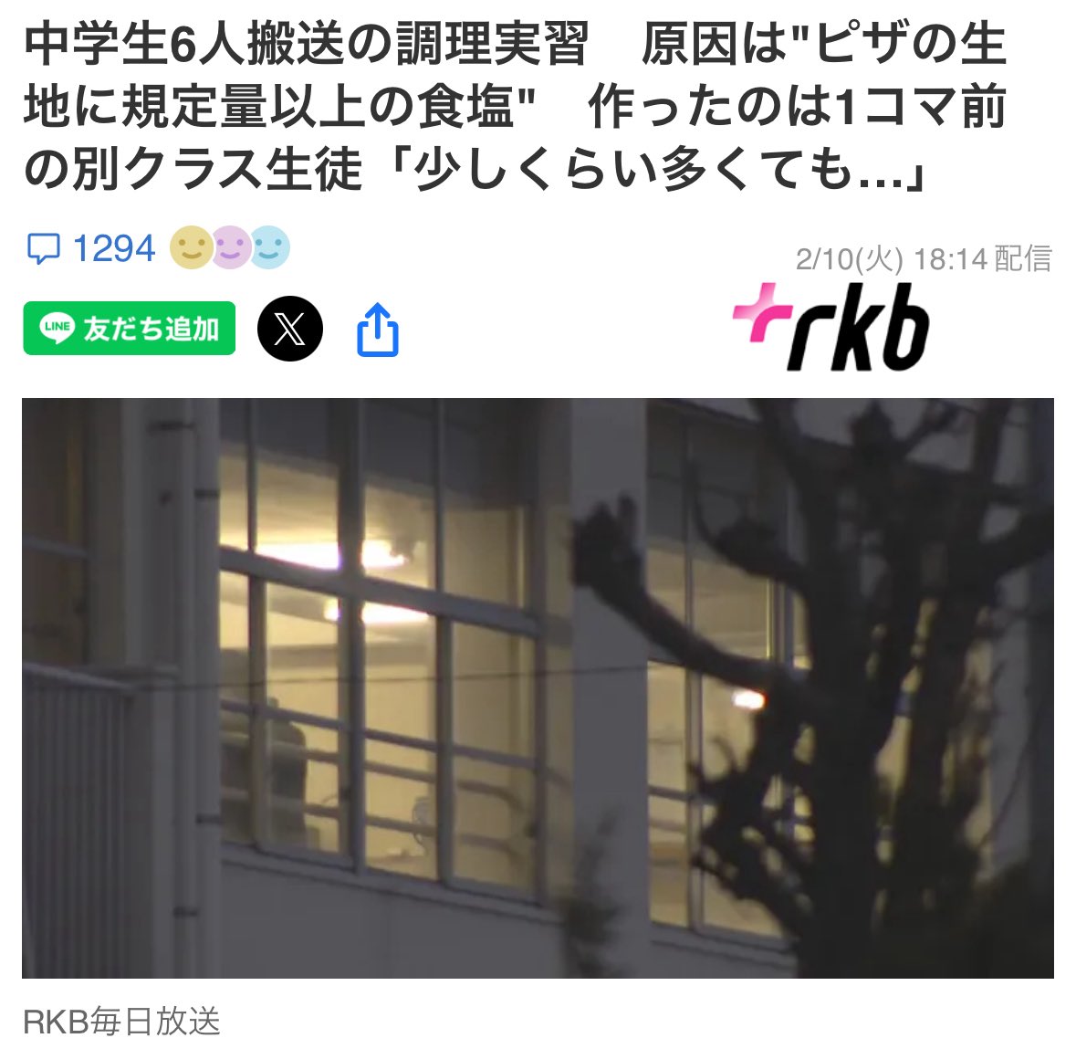 北九州市八幡西区の本城中で、家庭科の授業で調理したピザを食べた複数の生徒が体調不良を訴え、6人が病院に搬送された事案で、市教育委員会は10日、塩分の摂取過多が原因と推察されると発表した。