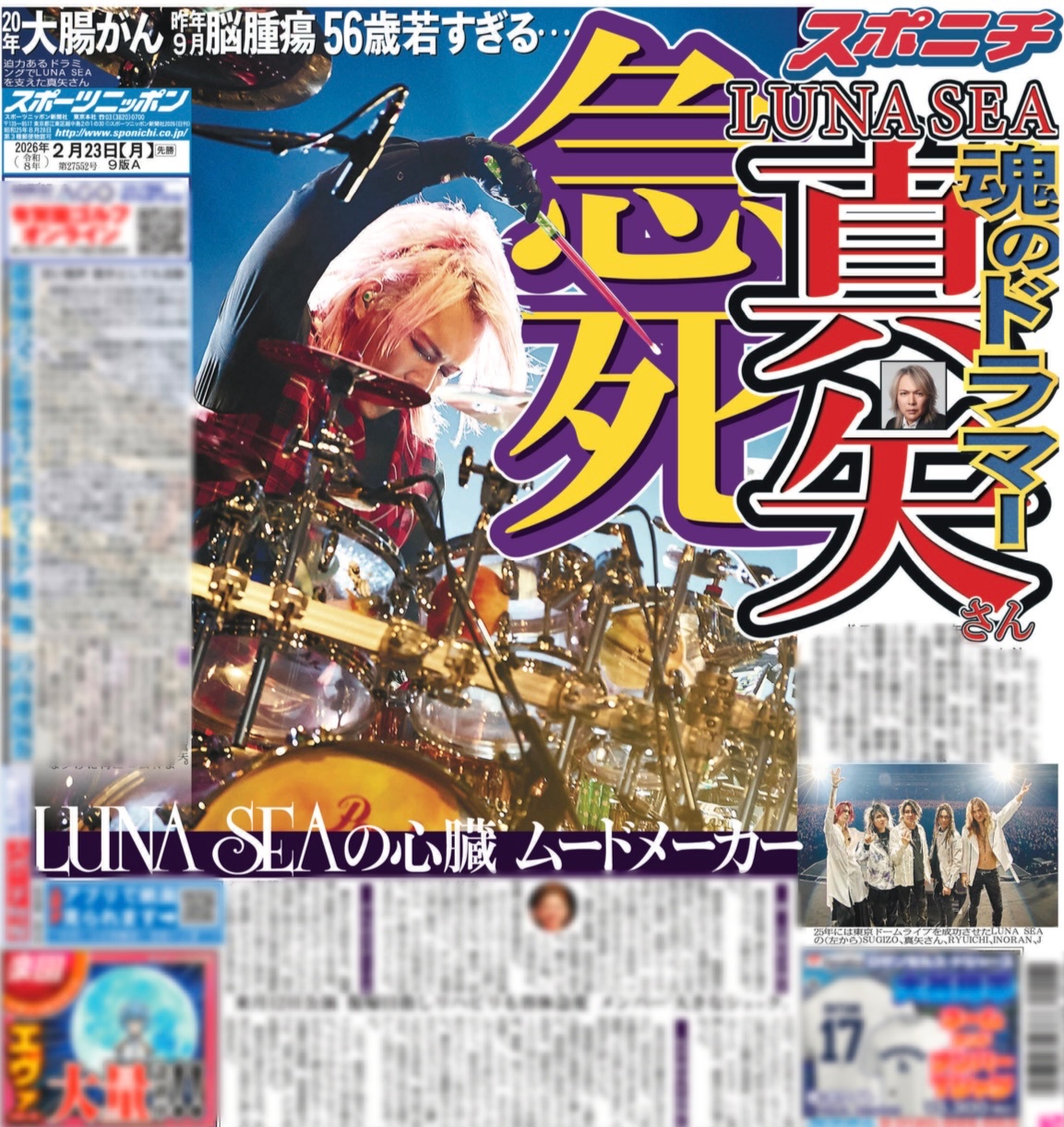 ロックバンド「LUNA SEA」のドラムス、真矢(しんや、本名山田真矢=やまだ・しんや)さんが17日午後6時16分、死去した。56歳。神奈川県出身。葬儀・告別式は近親者のみで済ませた。2020年にステージ4の大腸がん、昨夏に脳腫瘍と診断され、闘病していた。来月12日の公演でドラムを叩こうと懸命にリハビリを続けてきたが、かなわなかった。