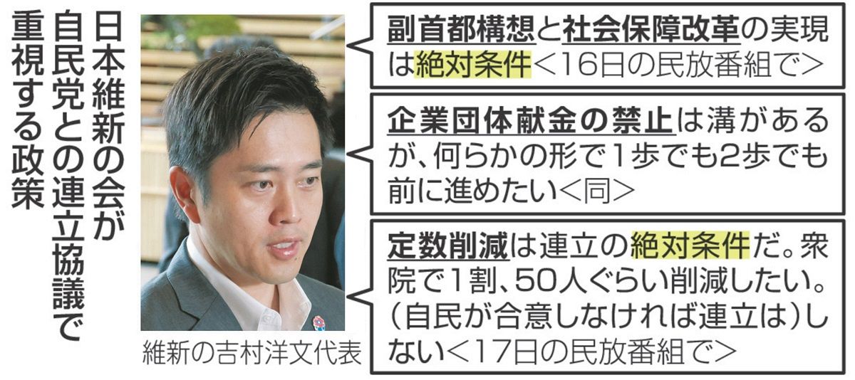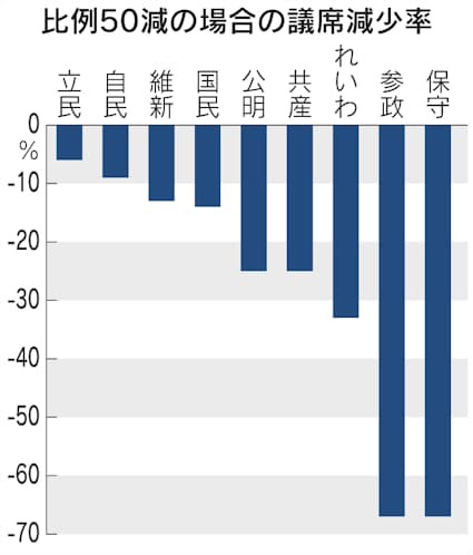 日本維新の会の吉村洋文代表(大阪府知事)は17日、議員定数の削減を自民党との連立の絶対条件にすると明言した。次期衆院選で定数465のおよそ1割にあたる50議席を減らすよう提案した。比例代表の定数減が念頭にある。維新案で各党の議席がどう変化するかを試算してみた。衆院選の比例代表は全国を11ブロックに分け、人口比に近づくよう「アダムズ方式」という計算手法で各ブロックの定数を決めている。(以下ソース)