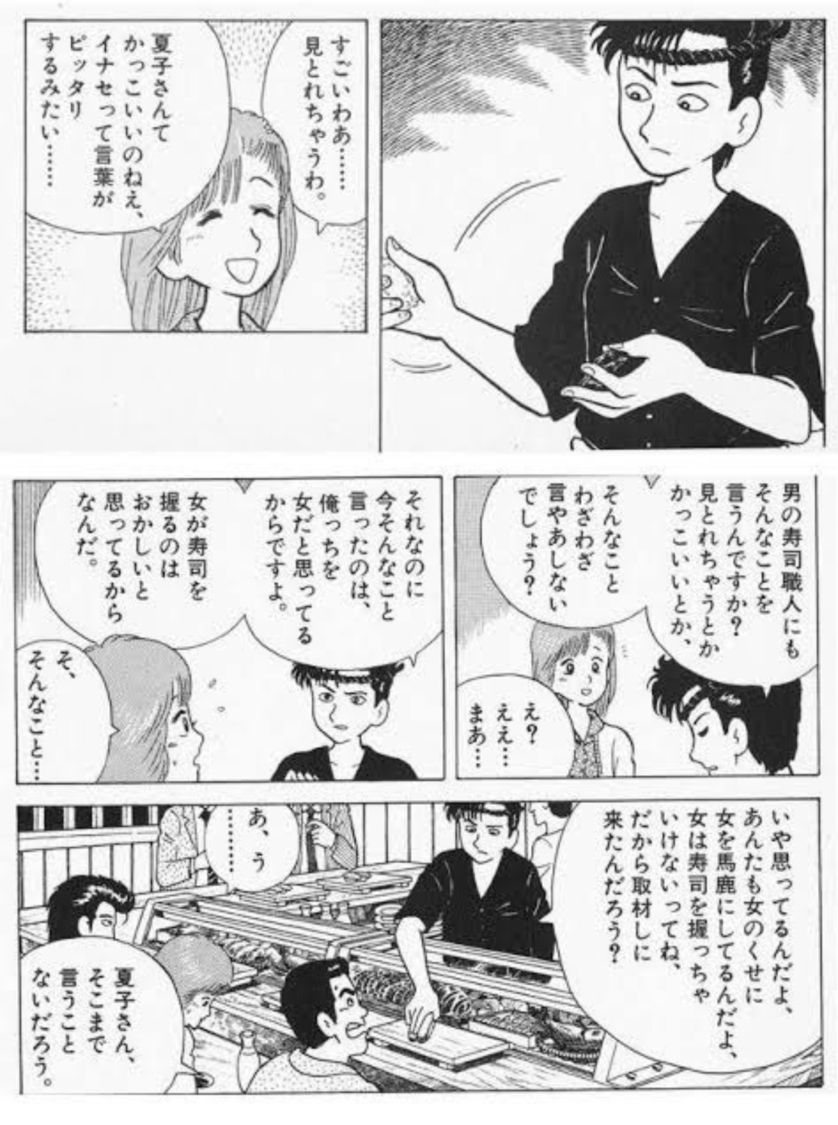 「この俗説はグルメ漫画『美味しんぼ』の『女の華』という回でも取り上げられています。女性の職人が寿司を握る店で、ある歌舞伎俳優が『女は体温が高い。温かい手でナマモノをいじられたら味が変わる』と偏見を口にするのですが、同席している編集者の女性が『女って冷え性なんですよ。手が男の人より温かい女の人なんて聞いたことないわ』、山岡士郎からも「封建的な男尊女卑の考えが女を料理人の世界から締め出しているに過ぎない」と反論するくだりがあります」