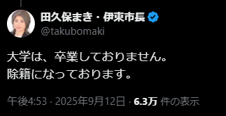 これにユーザーから「そこで『卒業証書』を皆に見せたら」といったコメントが寄せられたが、田久保氏は「大学は、卒業しておりません。除籍になっております」と改めて明言した。
