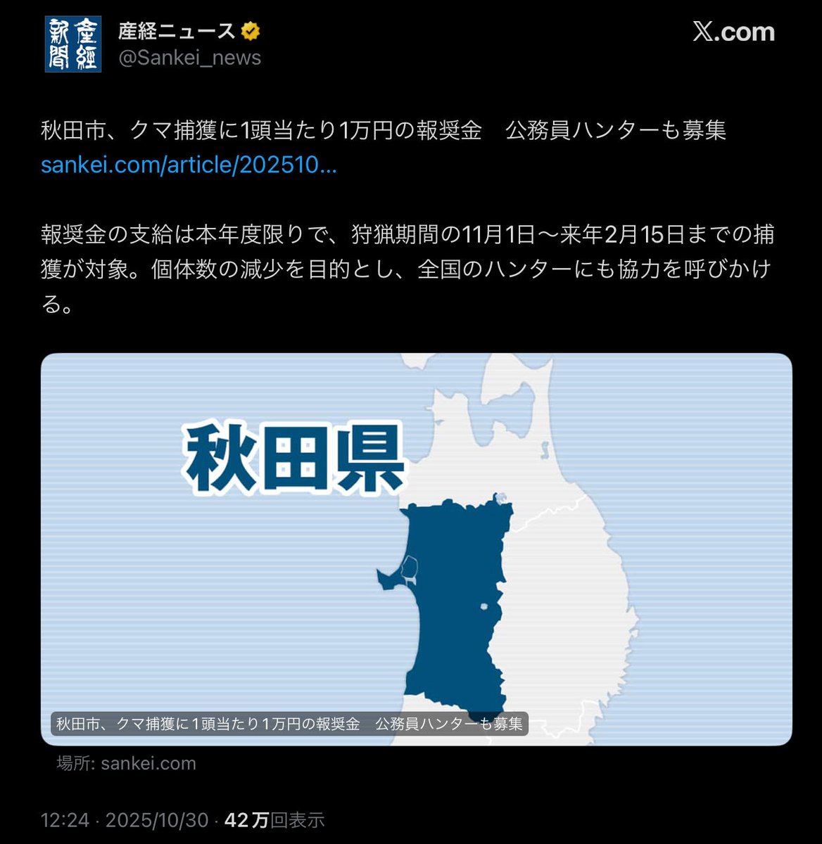 | 秋田市、クマ捕獲に報奨金 公務員ハンターも募集(共同通信) - Yahoo!ニュース 秋田市、クマ捕獲に報奨金 公務員ハンターも募集(共同通信) Yahoo!ニュース (出典:Yahoo!ニュース) |