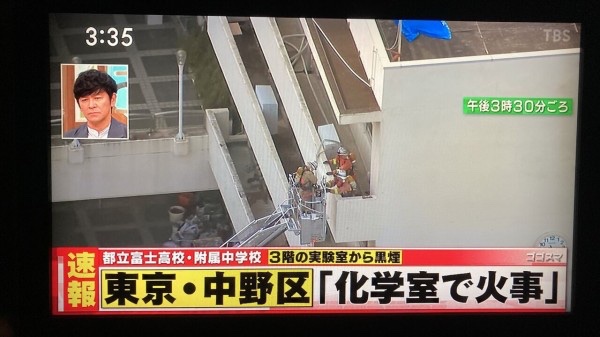 【速報】「化学室で火事があった」都立富士高校・付属中学校で火事 けが人の情報なし 警視庁 …警視庁と東京消防庁によりますと、きょう午後2時40分ごろ、東京・中野区弥生町の都立富士高校・付属中学校で「化学室で火事があった」と警備会社から119番通報がありました。 (出典:TBS NEWS DIG Powered by JNN)  |