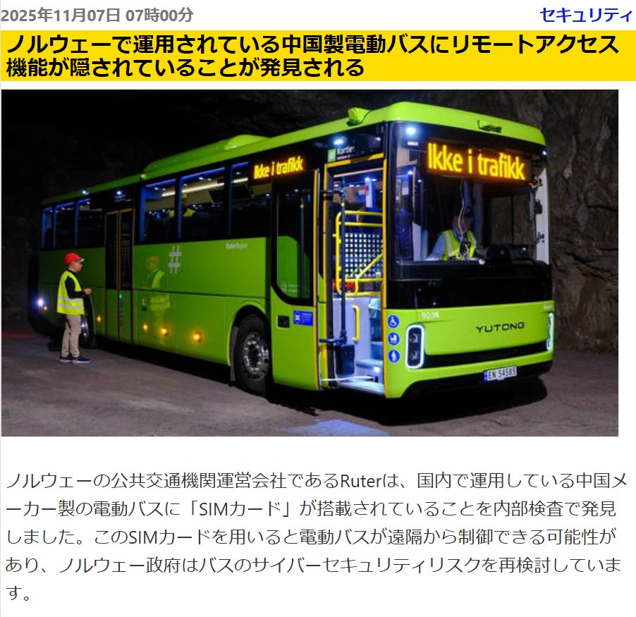 GIGAZINEノルウェーの公共交通機関運営会社であるRuterは、国内で運用している中国メーカー製の電動バスに「SIMカード」が搭載されていることを内部検査で発見しました。このSIMカードを用いると電動バスが遠隔から制御できる可能性があり、ノルウェー政府はバスのサイバーセキュリティリスクを再検討しています。