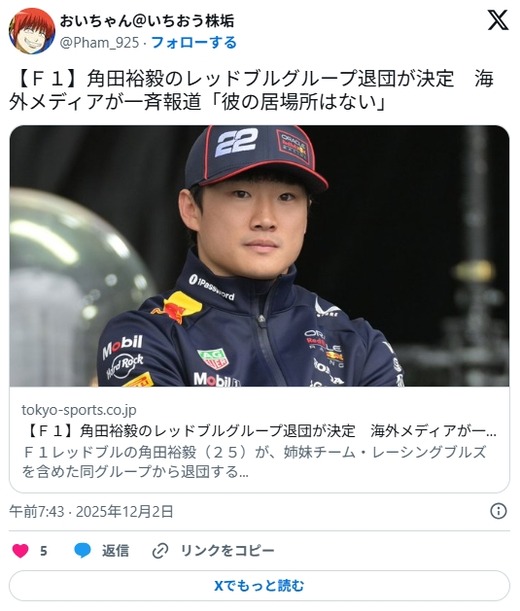 角田選手がレッドブルグループを離れることになるとは、多くのファンが戸惑いを感じていることでしょう。F1は厳しい競争が繰り広げられる世界ですが、彼の今後の活躍に期待しつつ、彼が新たなチャンスを見つけられることを願っています。