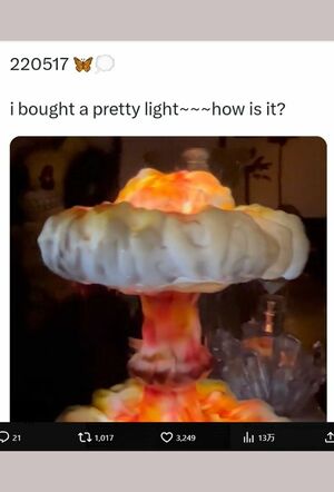 同年5月にニンニンさんがファン向けのアプリに、きのこ雲の形をしたランプの写真を投稿し「かわいいライトを買ったよ。どう?」と英語で書き込んでいた。
