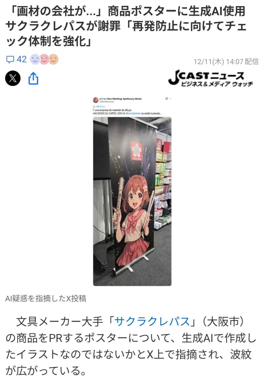 老舗文具メーカーのサクラクレパスは12月11日、スペインで開催されたイベント「Manga Barcelona」(マンガバルセロナ)で使用した販促ポスターについて「生成AIで制作されていた」と公表した。同ポスターを巡っては、X上で「AIで作ったものではないか」との疑惑が浮上。9日に、ポスターの使用を停止するとの声明を出していた。