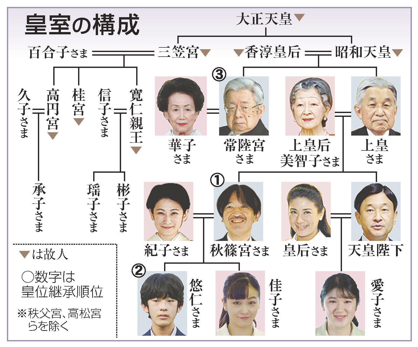 皇室は現在、16人で構成されている。このうち皇位継承の資格があるのは秋篠宮さま(60)、秋篠宮家の長男悠仁さま(19)、常陸宮さま(90)の3人。