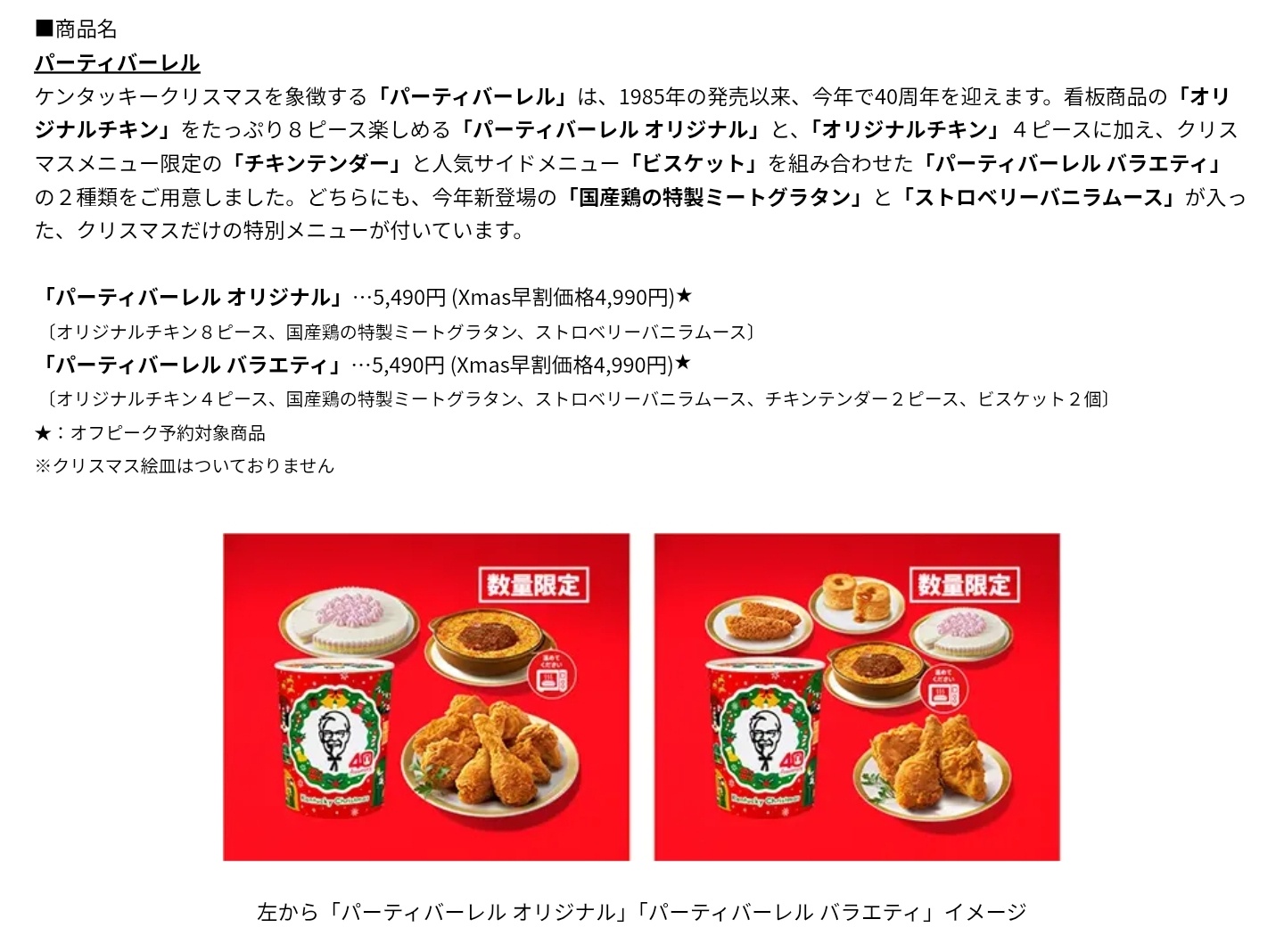 ケンタッキーのパーティーバーレルが話題になっていますね。期待していたサイズや内容と違ったと感じる方も多いのではないでしょうか。また、パーティーの場にピッタリのメニューを求めている人たちからすると、残念な結果になってしまった印象です。今後の改善に期待したいです。