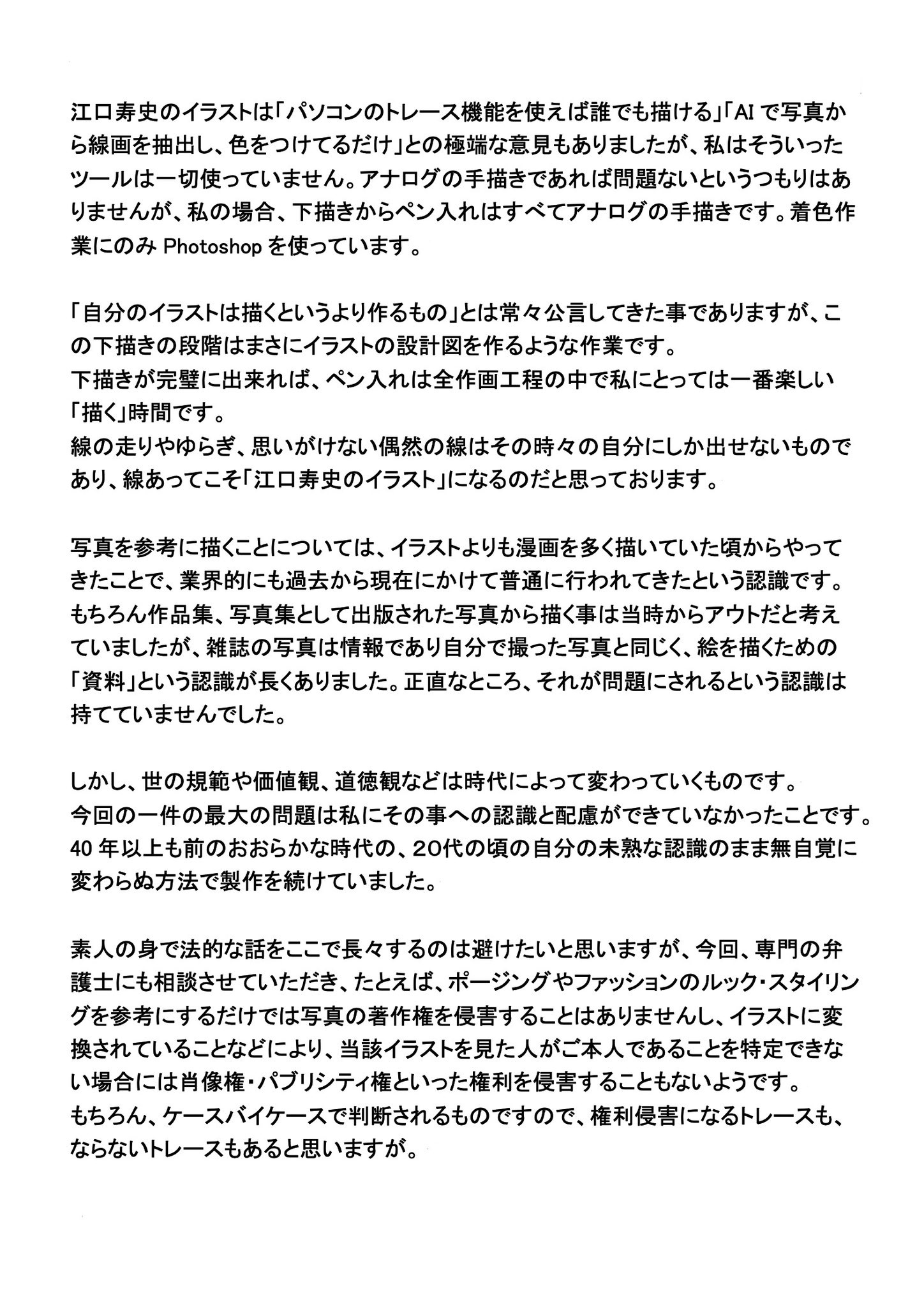 江口寿史さんの謝罪は、多くの人にとって驚きと同時に、彼の誠意を感じる瞬間でもありました。イラストレーターとしての影響力が大きいだけに、彼の行動には多くの目が注がれています。今後は、より一層注意深く、クリエイティブな表現を行っていただきたいと願っています。
