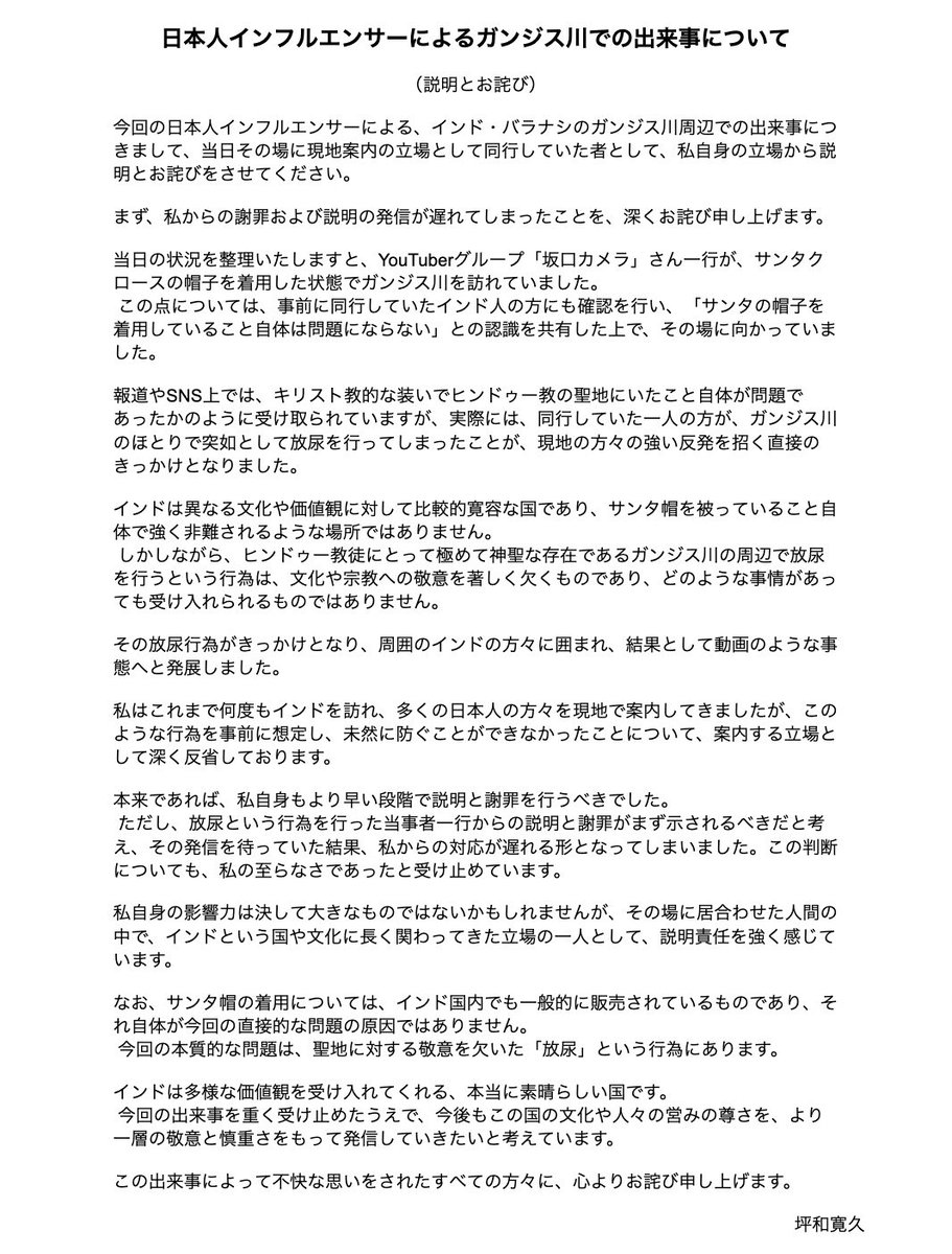 3人組ユーチューバー「坂口カメラ」が昨年12月31日、公式インスタグラムを更新。インド・ガンジス川周辺で現地の人たちから抗議されているような動画が拡散されている騒動について、謝罪文を公開した。