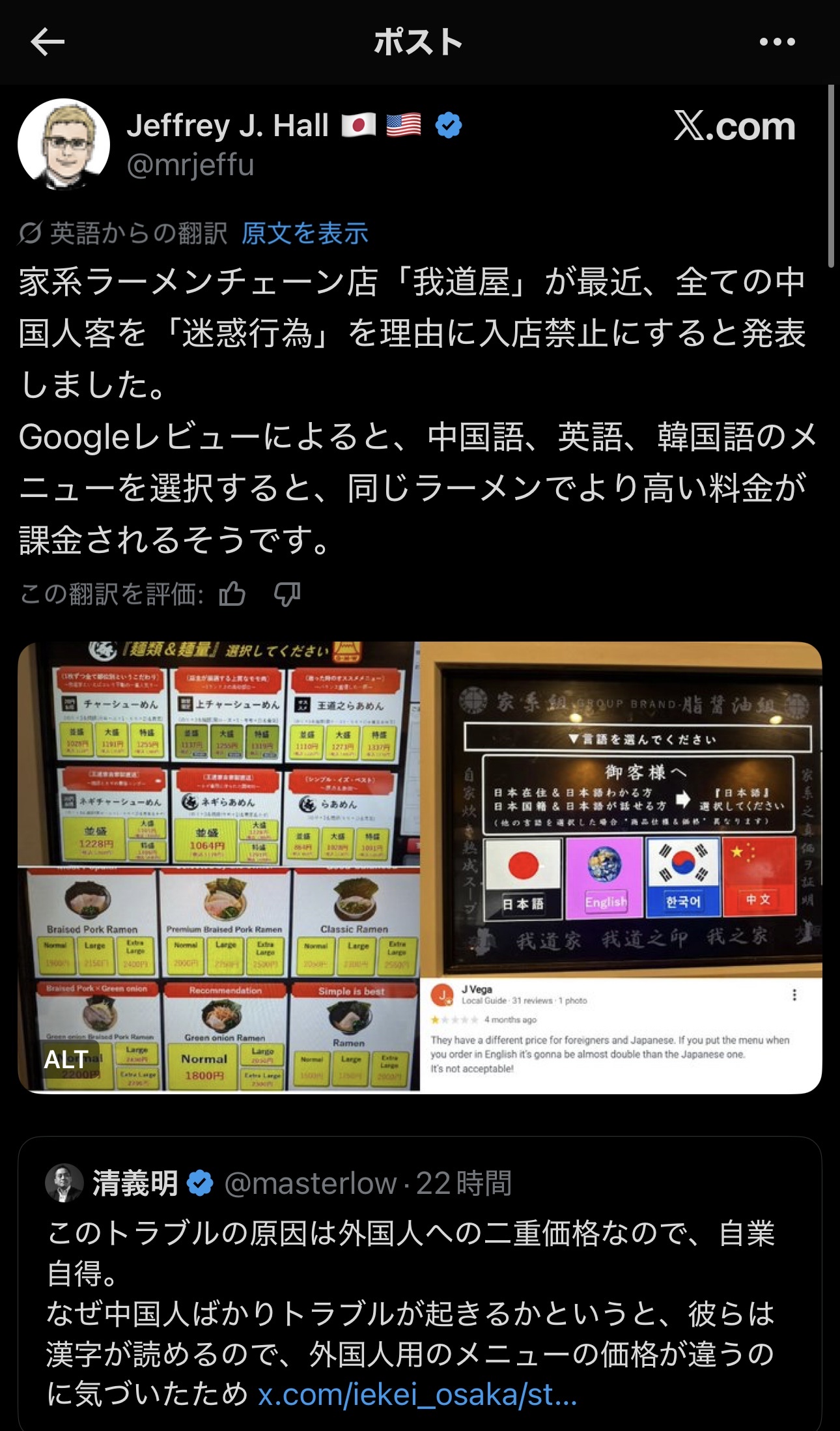 「外国人料金」は必ず破綻する─大阪ラーメン店騒動が証明した、二重価格の唯一解(木曽崇氏) ★2 [少考さん★]