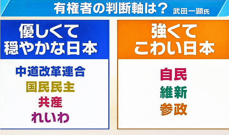 はい(とフリップを示す)。優しくて穏やかな、中道、国民民主、共産、れいわ。強くてこわいと思われる日本は、自民、維新、参政が