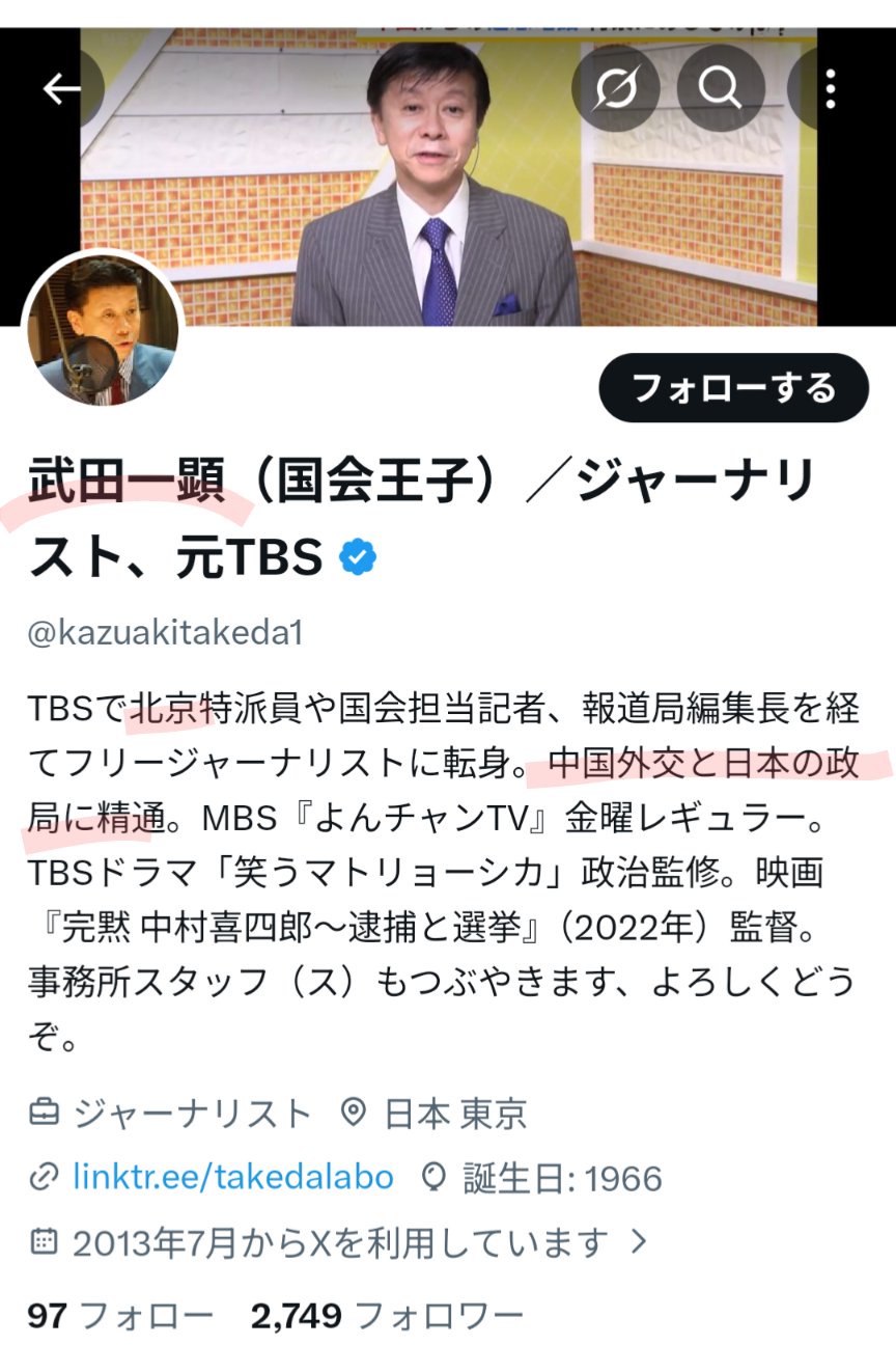 武田氏はTBS時代に北京特派員や報道局編集長を歴任しており、自身のX(旧ツイッター)プロフィールでも「中国外交と日本の政局に
