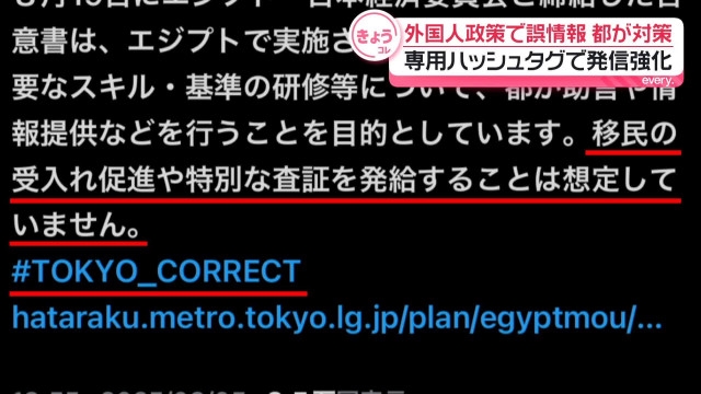 都は8月、エジプト・日本経済委員会と雇用分野に関する合意書を締結。ただ、SNSでは「移民受け入れに合意した」などの誤情報が拡散した。9月には、ビジネスなどで滞在する外国人向け住宅整備での国家戦略特区制度活用について「税金で移民を高級マンションに住まわせる」「なぜ都民の税金を使うのか」などの投稿が相次いだ。