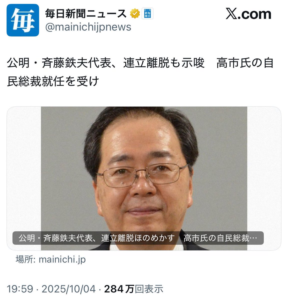 公明・斉藤鉄夫代表、連立離脱も示唆 高市氏の自民総裁就任を受け ★3 [どどん★]