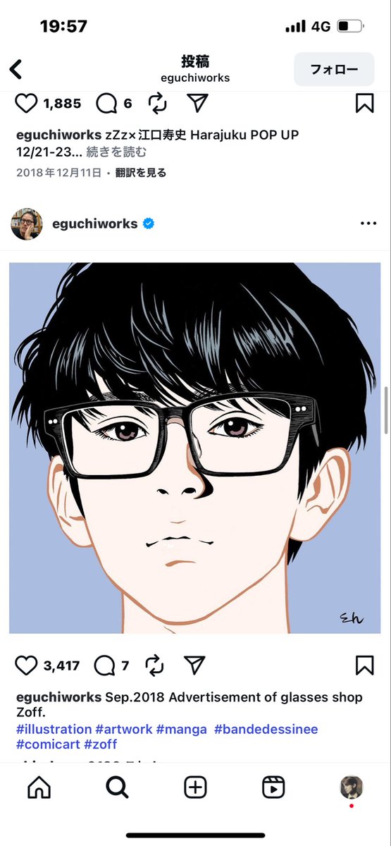 同社は2018年、江口氏が描き下ろした“理想のメガネ男子・メガネ女子”のイラストを店舗に飾るキャンペーンを実施した。