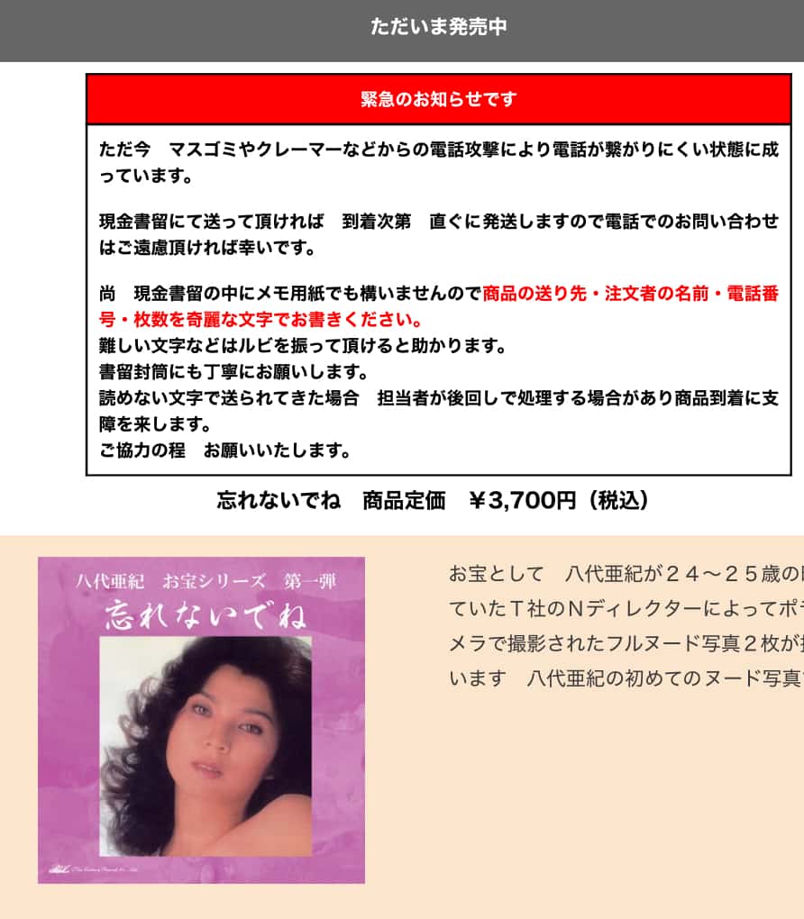 @2atrass「暴走を世の中が止められないのか」八代亜紀さん私的写真付きCD第2弾発売…販売元が送っているDMの非道な11文字 pinzuba.news/articles/-/148… この商売まだやってたのか! 誰が買うねん!