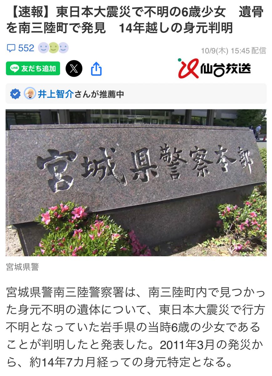 宮城県警南三陸警察署は、南三陸町内で見つかった身元不明の遺体について、東日本大震災で行方不明となっていた岩手県の当時6歳の少女であることが判明したと発表した。2011年3月の発災から、約14年7カ月経っての身元特定となる。https://news.yahoo.co.jp/articles/dea9bfd7c1ab0ab0e3960a85d6a77e5cfdd02ccf