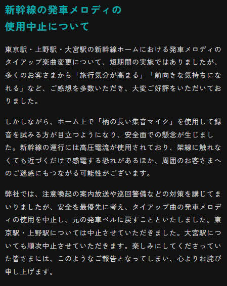 JR東、SixTONESタイアップの発車メロディを使用中止 「安全面での懸念」が理由 JR東日本は、東北新幹線の東京駅、上野駅、大宮駅で使用していた「SixTONES」の楽曲による発車メロディについて、使用を中止すると発表しました。